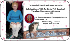 The Turnbull Family will celebrate the life of Betty PC Turnbull (1927-2020) on Veterans Day, November 11, 2025, exactly 50 years after we celebrated Herb Turnbull's Life at St. Bartholomew's Episcopal Church, 678 Enos Way, Livermore, CA.